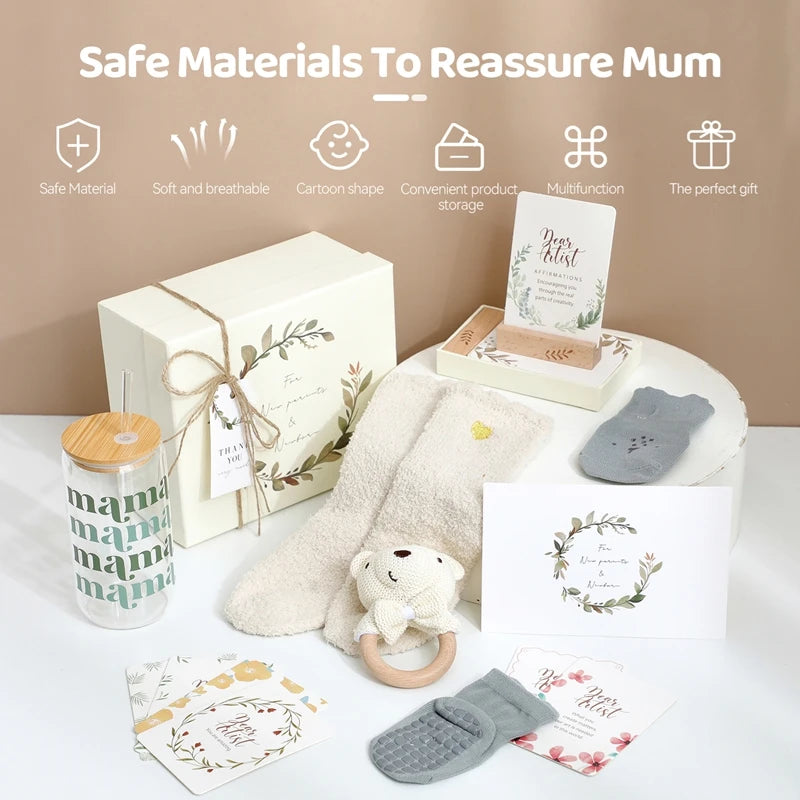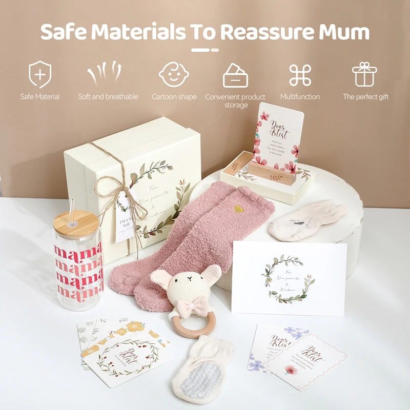 This carefully curated Baby Bathing Set makes an ideal gift for newborns, combining essential care and keepsake items. It includes a gentle wooden rabbit teether and rattle, crafted to soothe and stimulate your baby naturally. Soft cotton socks provide cozy comfort, while the newborn growth memorial card offers a meaningful way to track early milestones. Presented in an elegant gift box, this set supports both practical needs and sentimental moments in a baby's first months.
