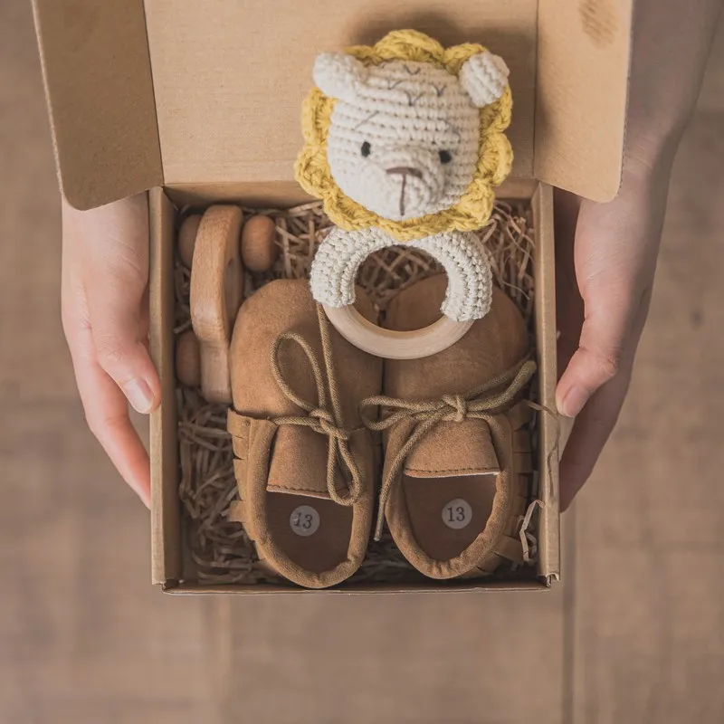 This newborn bath set combines practicality and charm, featuring a double-sided cotton towel that is gentle on delicate skin. Included are a wooden rattle and soft brushes, perfect for soothing and cleaning your baby. The crochet bracelet adds a handcrafted touch, making it an ideal gift for baby showers or birthdays. Presented in a tasteful gift box, this set offers both comfort and thoughtful design for your little one’s bath time and early days.