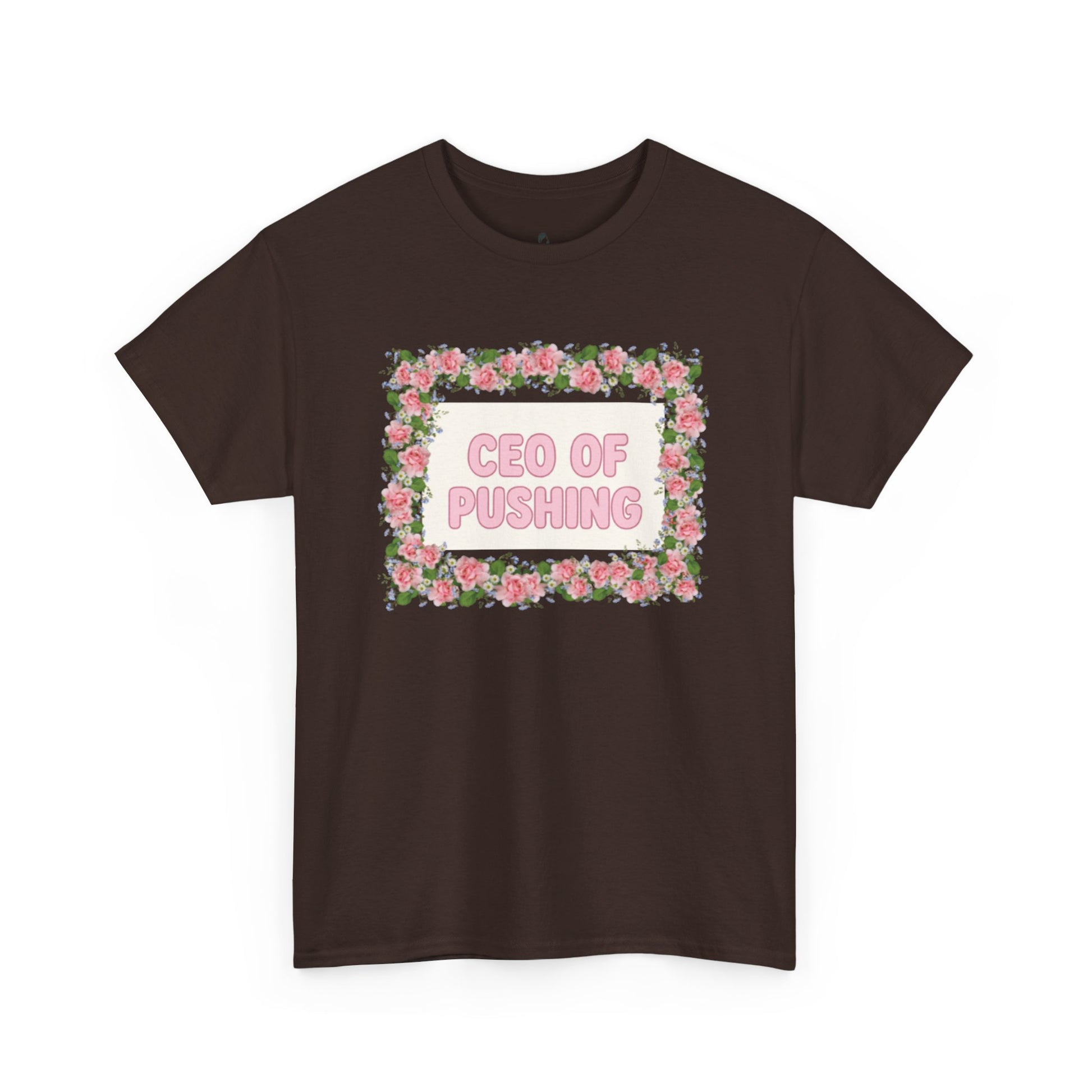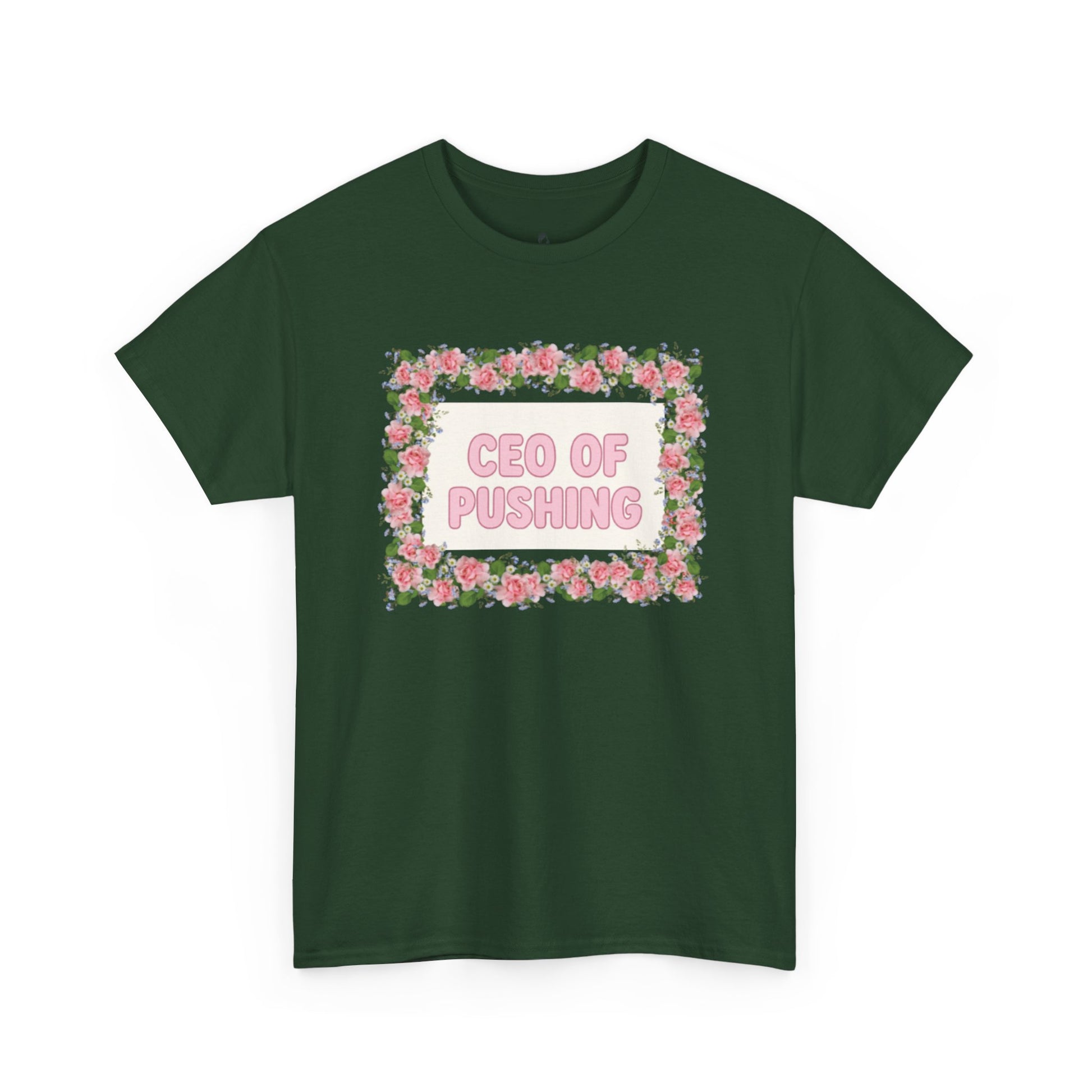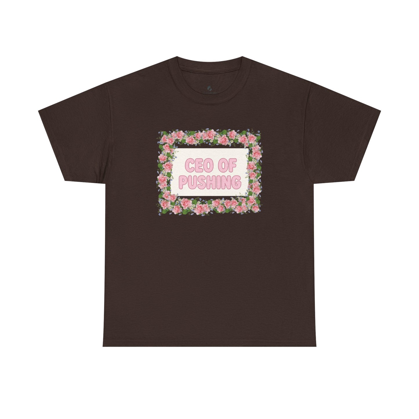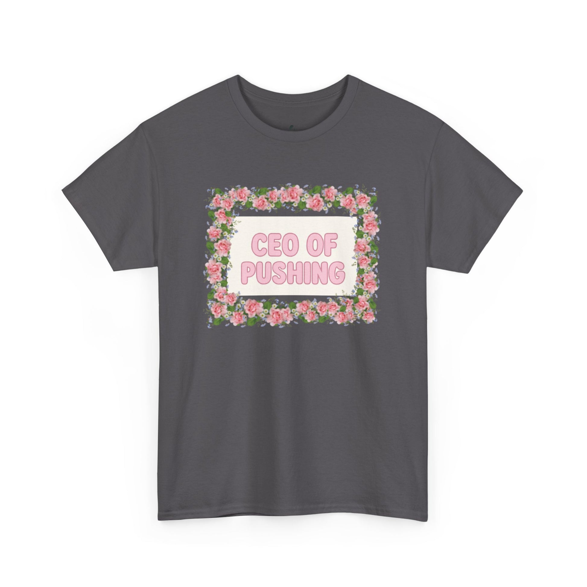Introducing our stylish Unisex Heavy Cotton Tee, the perfect blend of comfort and chic design. This classic tee features a vibrant floral border with the fun slogan 'CEO Of Pushing,' making it a bold statement for anyone who loves to express their personality through fashion. Made for year-round wear, this shirt fits seamlessly into casual outings, brunch dates, or even as a cozy option for lounging at home. Intended for adults, it’s ideal for lively celebrations, birthdays, or casual gatherings with friends. Whether you're buying for yourself or gifting to a fellow fashion-forward friend, this tee promises to deliver both style and comfort.