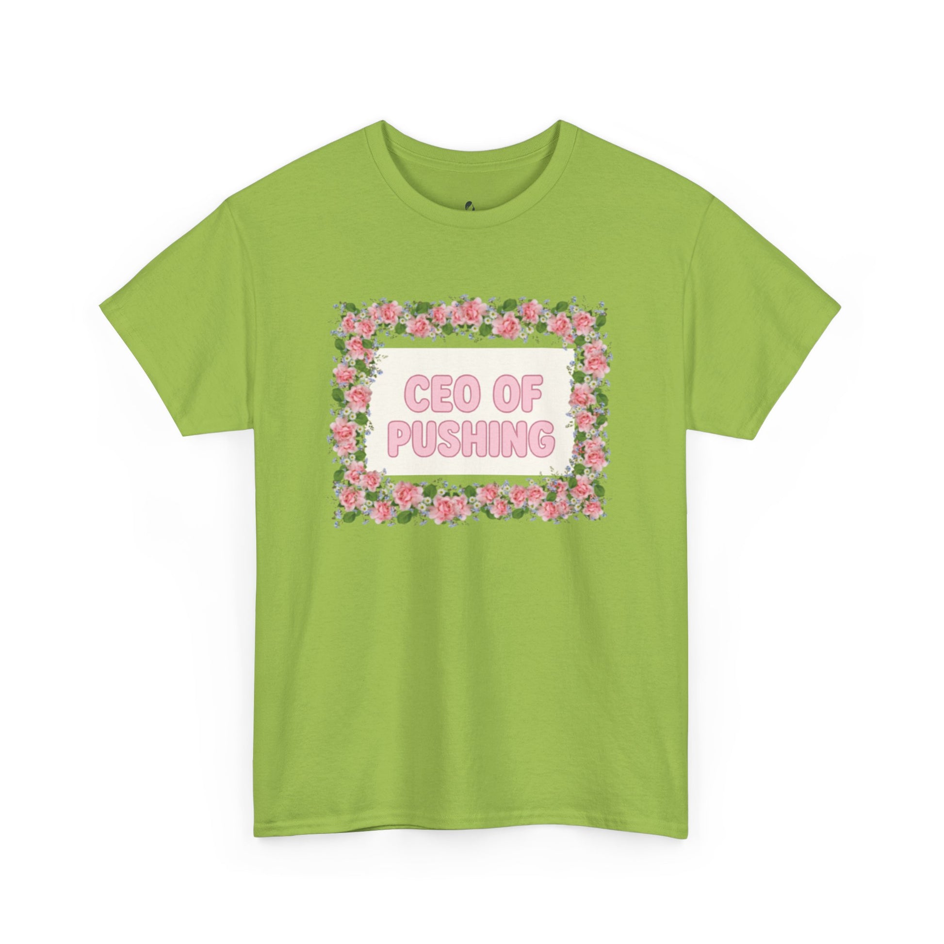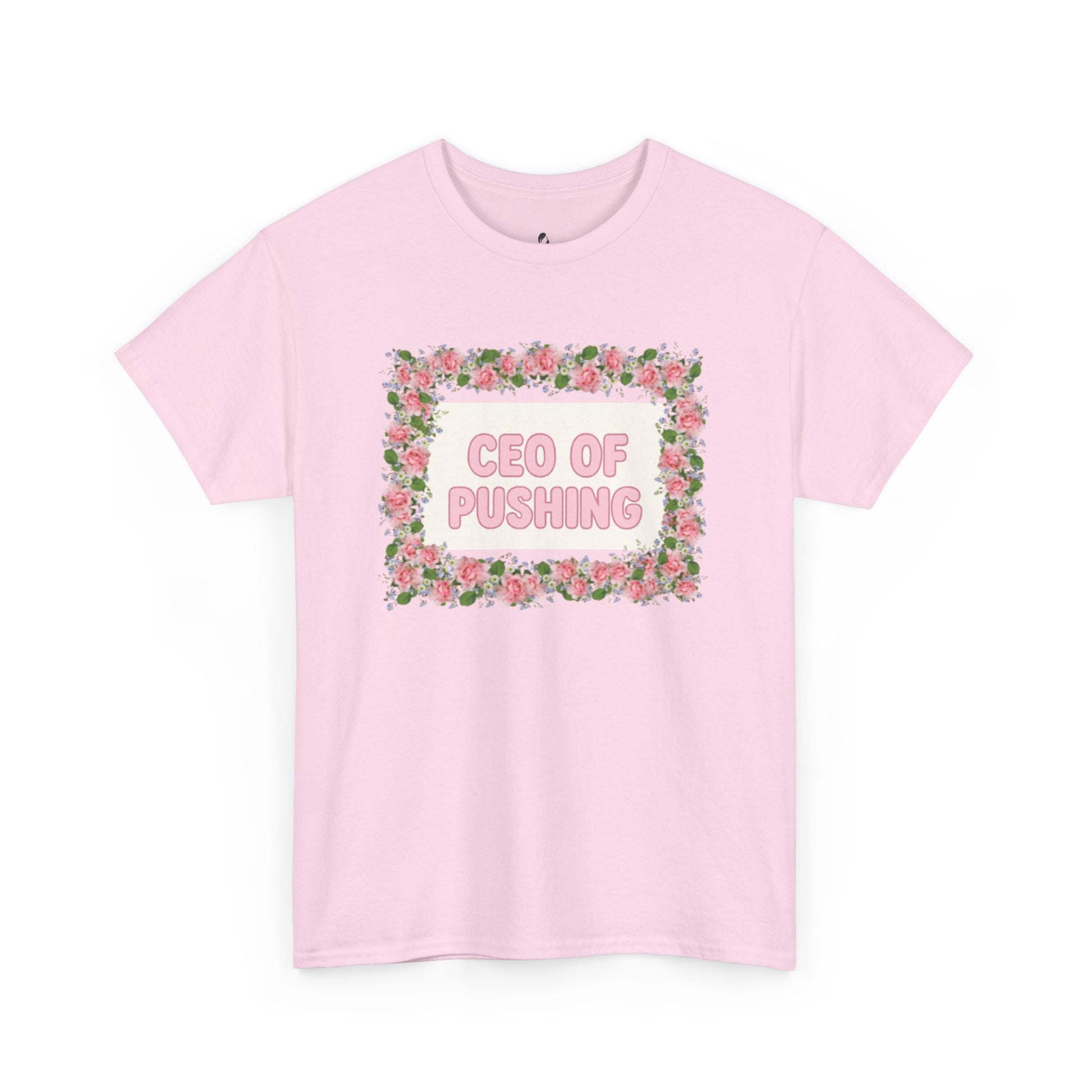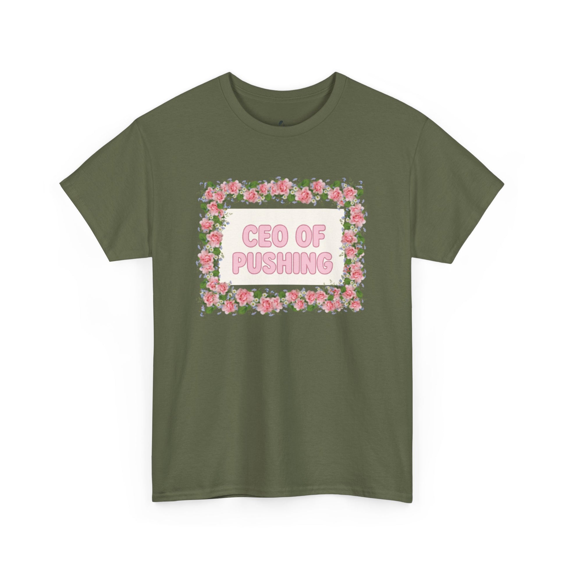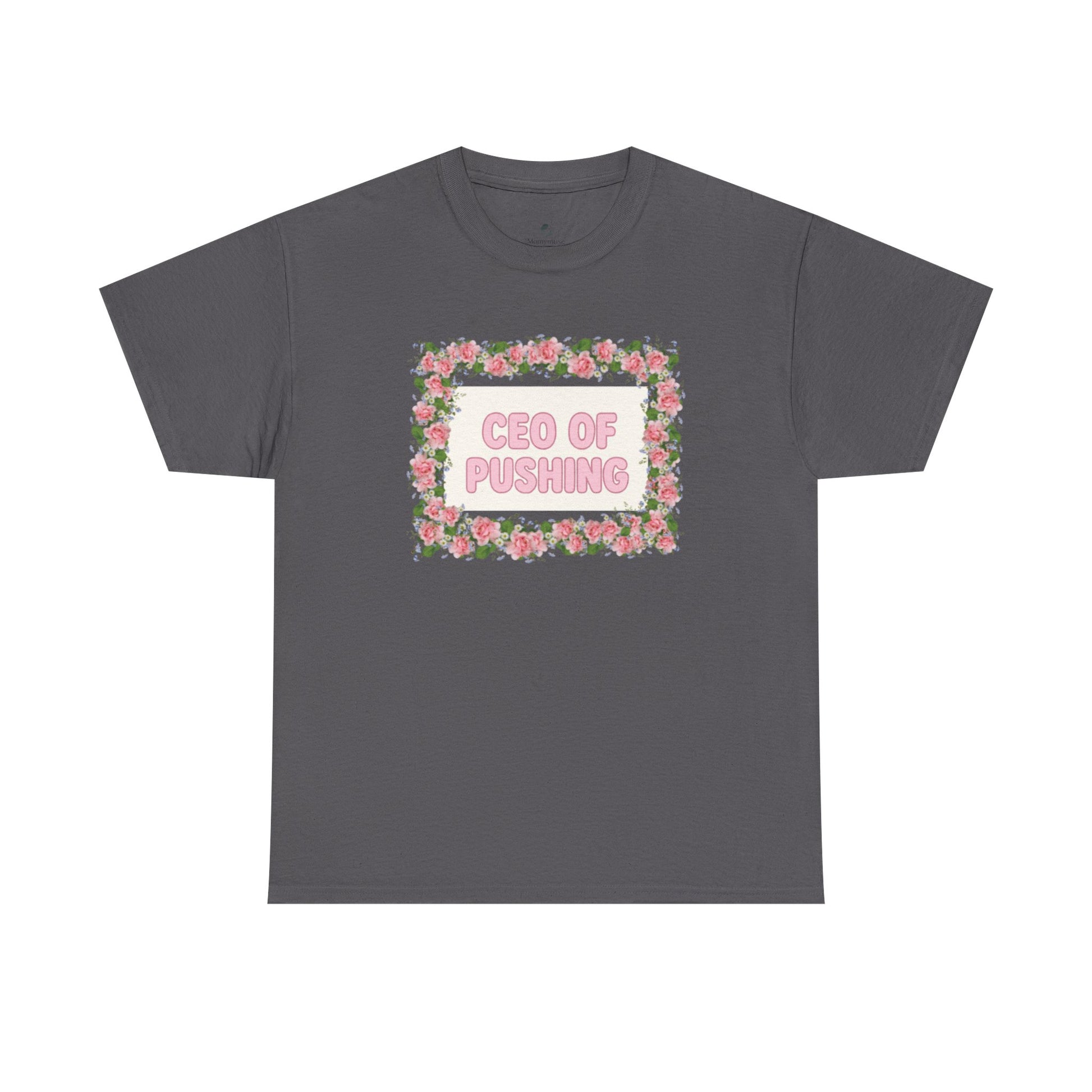 Introducing our stylish Unisex Heavy Cotton Tee, the perfect blend of comfort and chic design. This classic tee features a vibrant floral border with the fun slogan 'CEO Of Pushing,' making it a bold statement for anyone who loves to express their personality through fashion. Made for year-round wear, this shirt fits seamlessly into casual outings, brunch dates, or even as a cozy option for lounging at home. Intended for adults, it’s ideal for lively celebrations, birthdays, or casual gatherings with friends. Whether you're buying for yourself or gifting to a fellow fashion-forward friend, this tee promises to deliver both style and comfort.