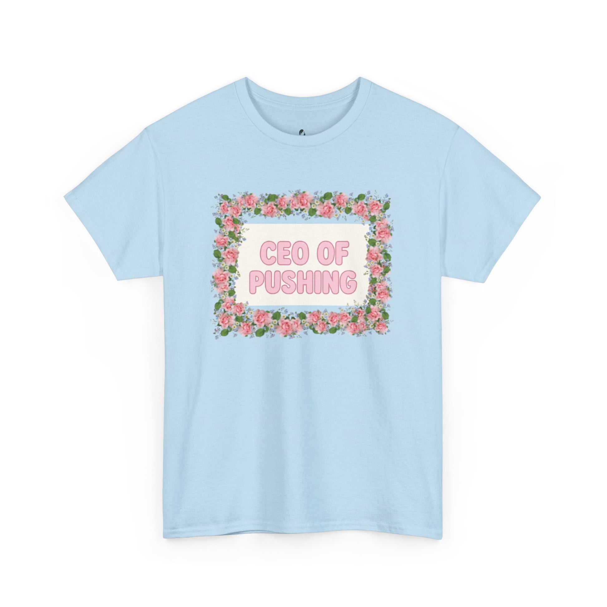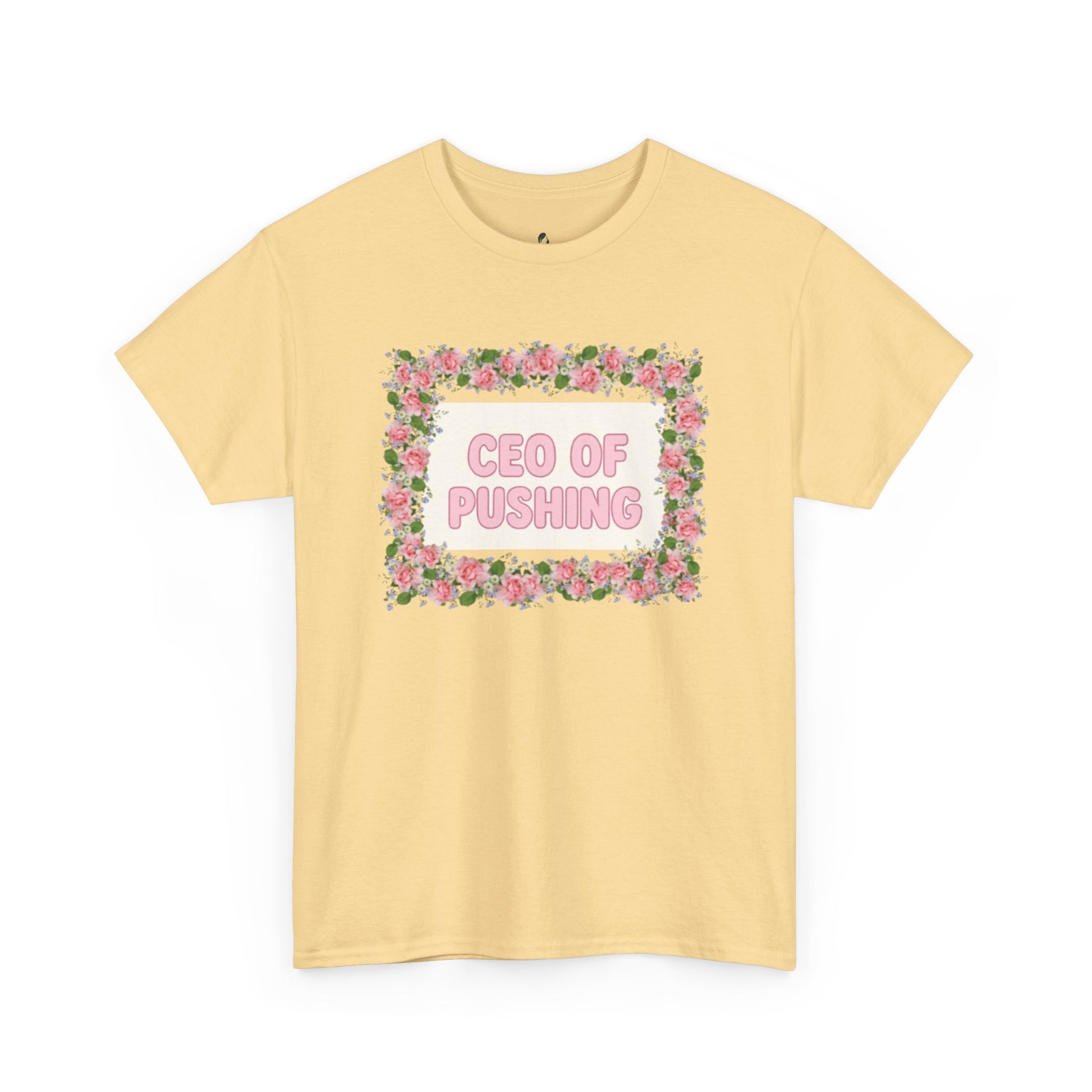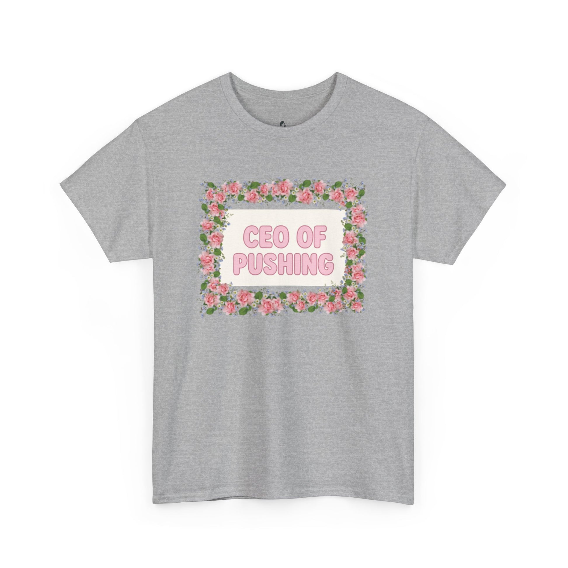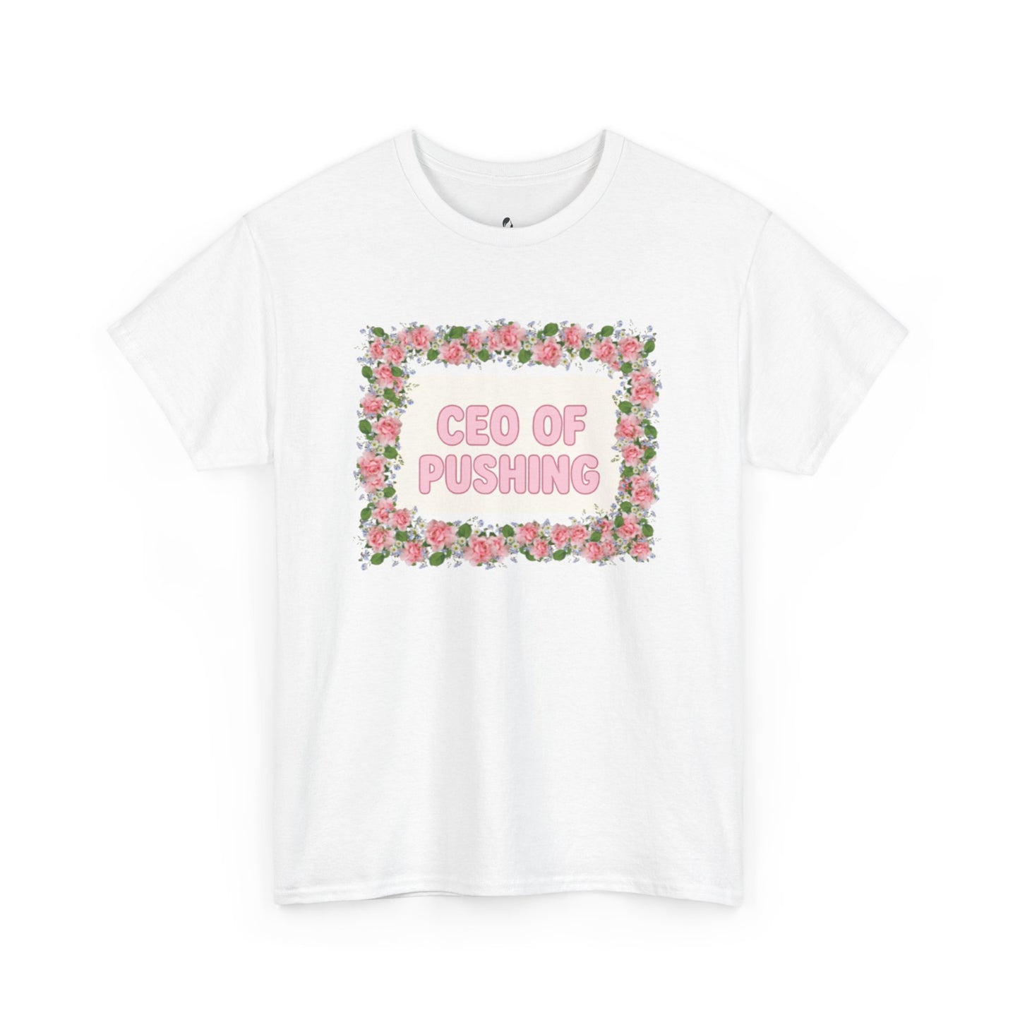 Introducing our stylish Unisex Heavy Cotton Tee, the perfect blend of comfort and chic design. This classic tee features a vibrant floral border with the fun slogan 'CEO Of Pushing,' making it a bold statement for anyone who loves to express their personality through fashion. Made for year-round wear, this shirt fits seamlessly into casual outings, brunch dates, or even as a cozy option for lounging at home. Intended for adults, it’s ideal for lively celebrations, birthdays, or casual gatherings with friends. Whether you're buying for yourself or gifting to a fellow fashion-forward friend, this tee promises to deliver both style and comfort.