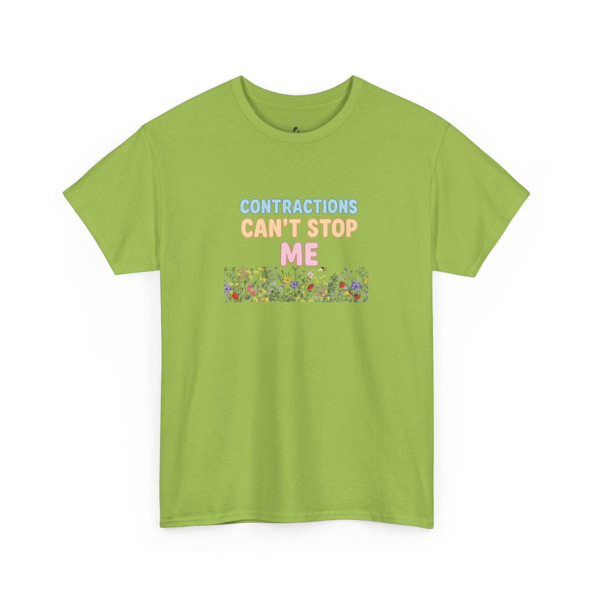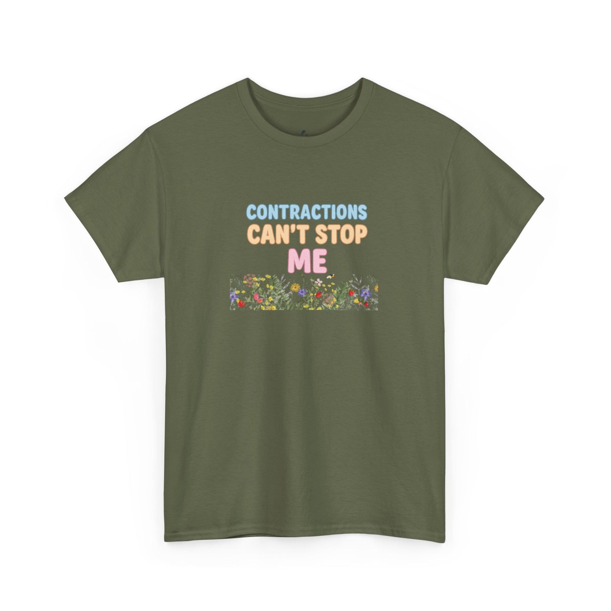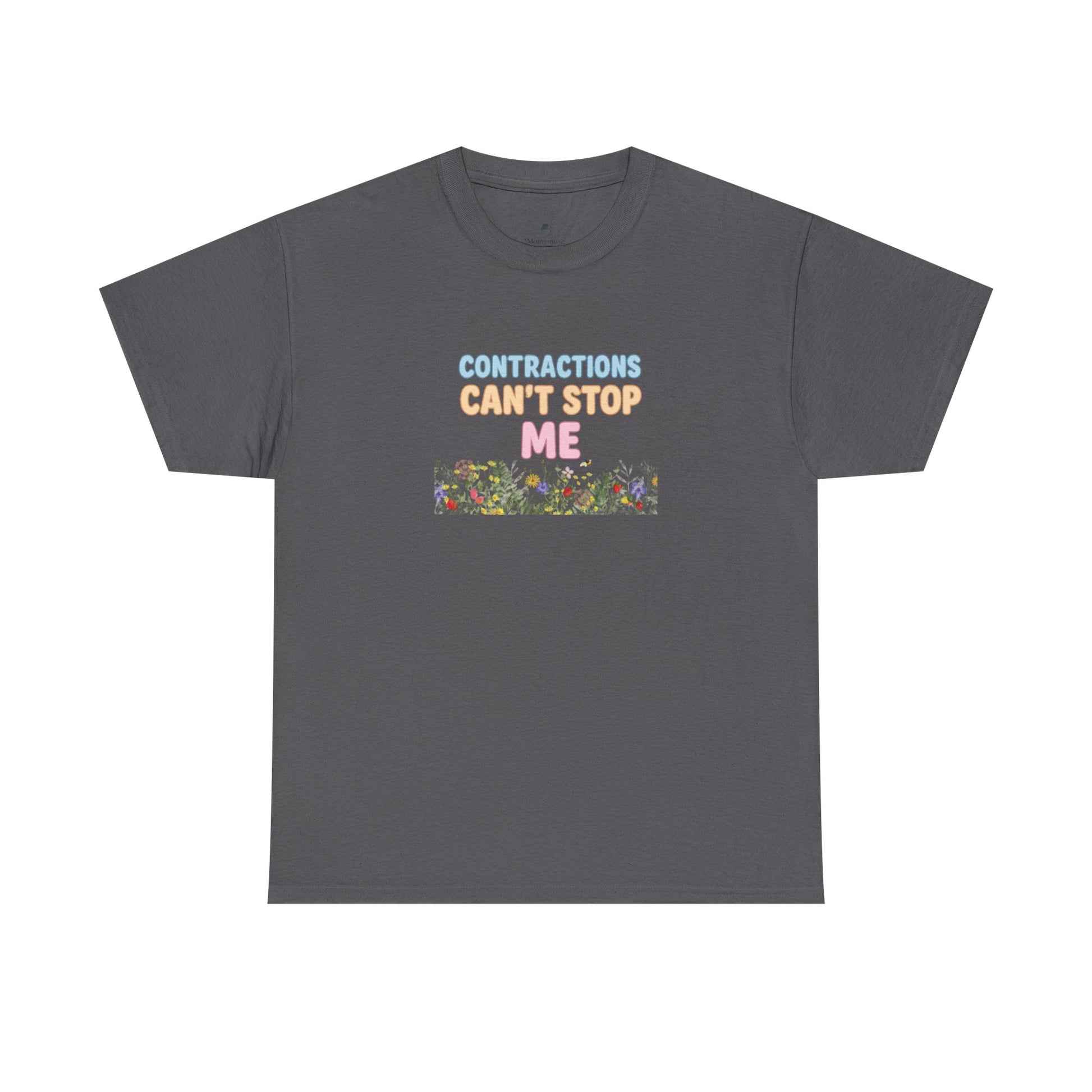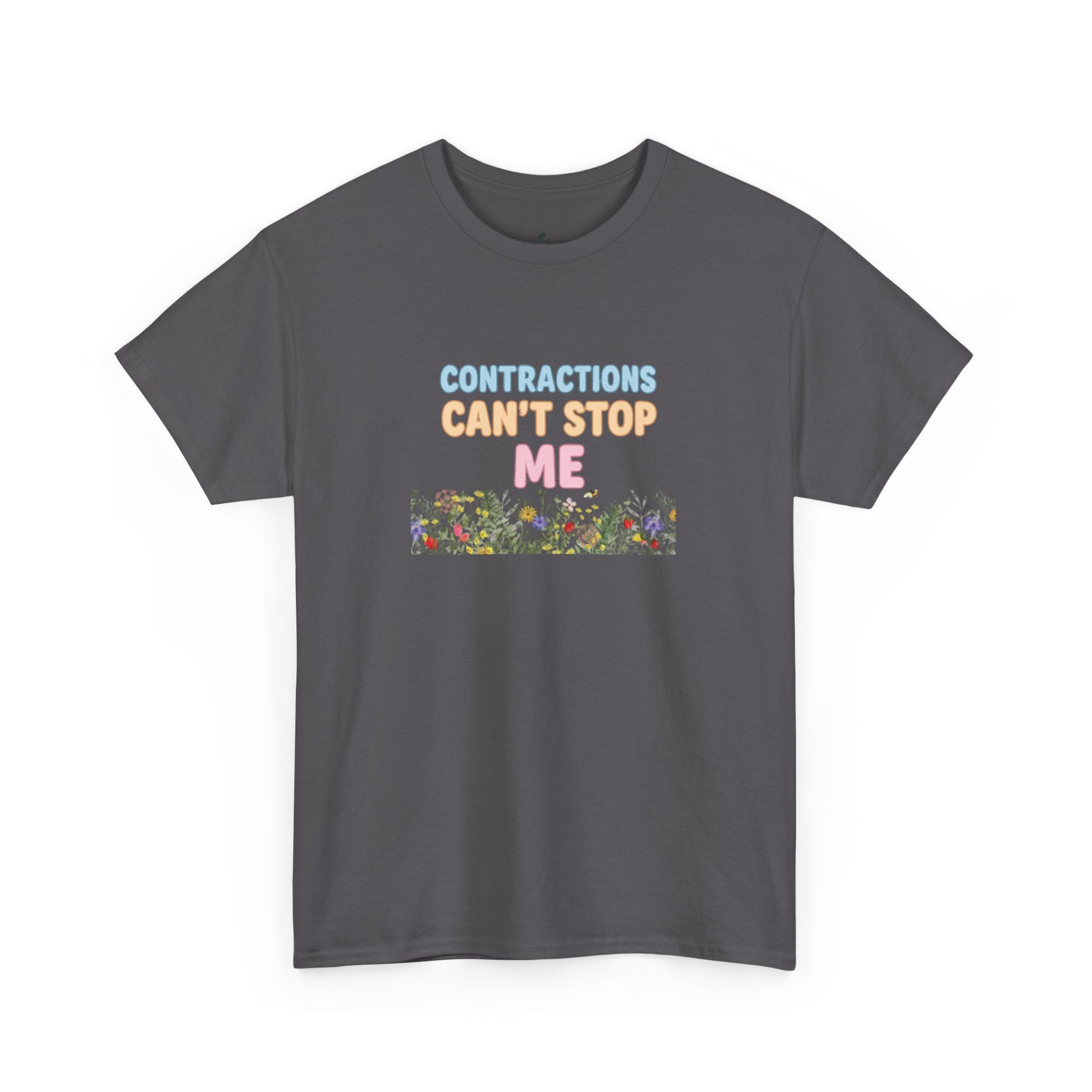 heavy cotton tee that radiates positivity and resilience! This shirt features a vibrant and playful design with the phrase "Contractions Can't Stop Me", making it a delightful addition to any casual outfit. It's ideal for expectant mothers celebrating milestones, or anyone who appreciates a light-hearted take on life's challenges.