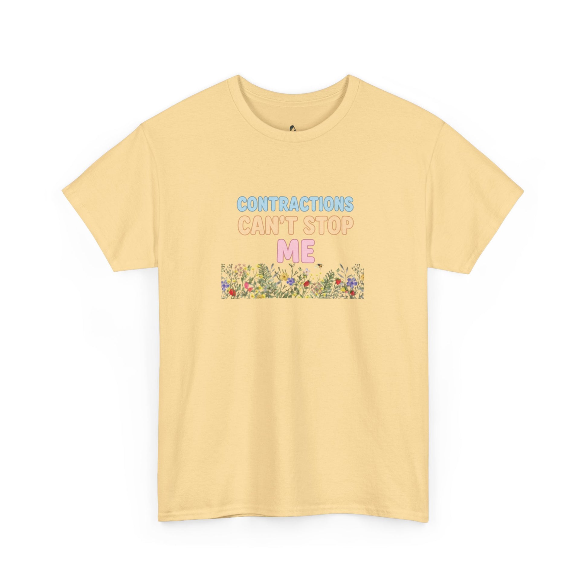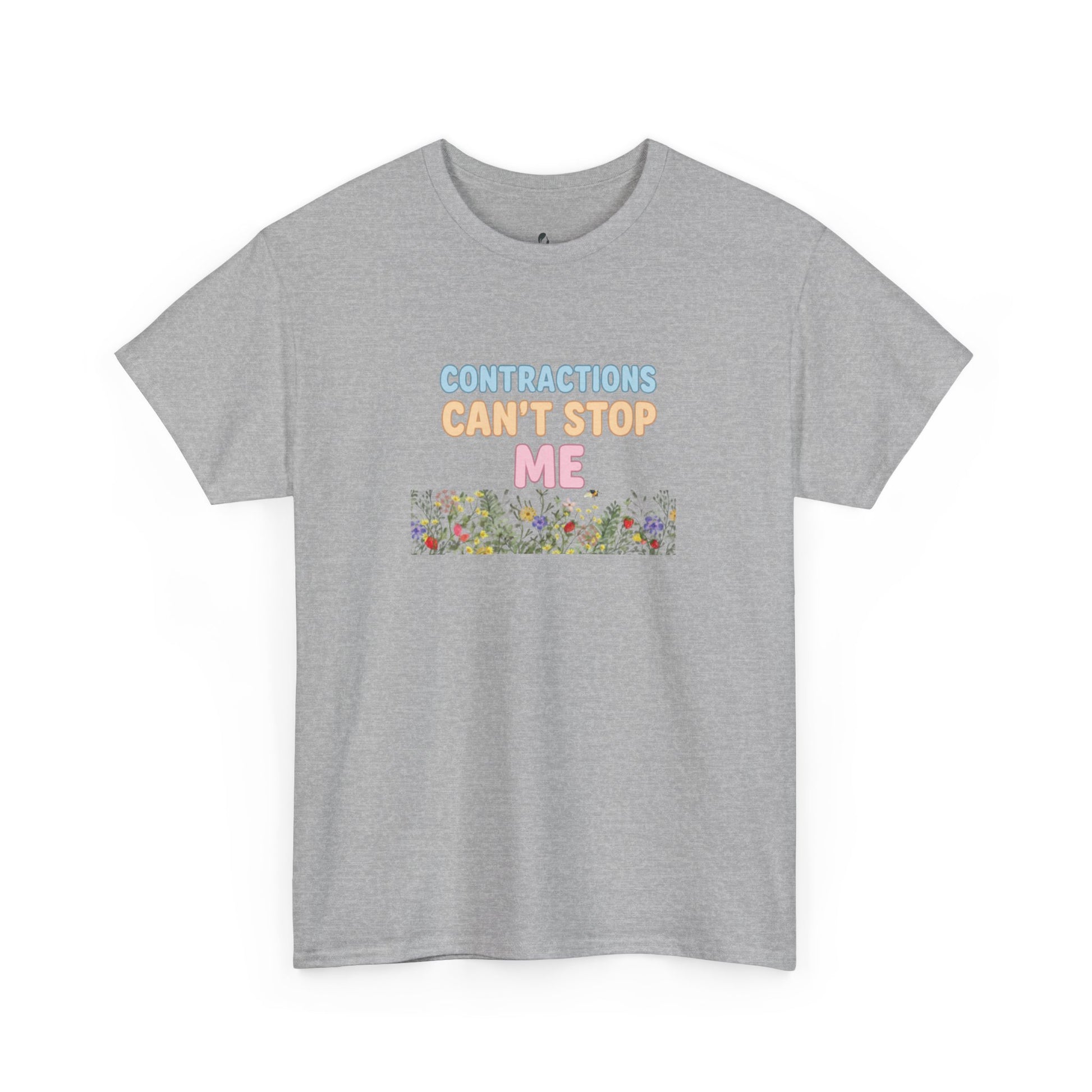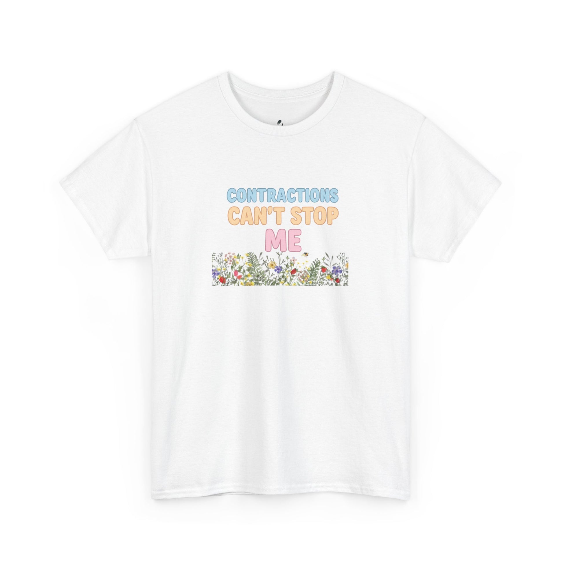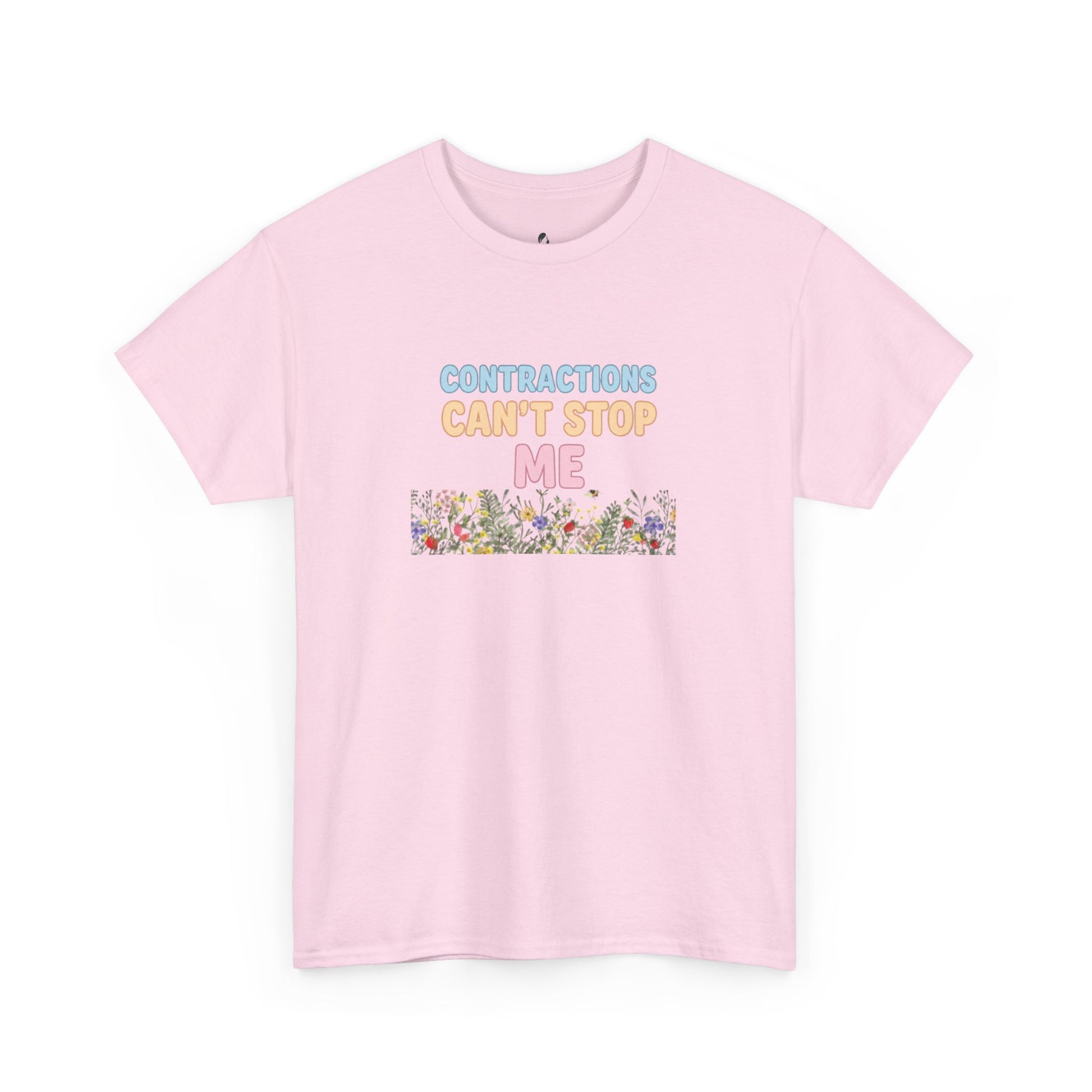 heavy cotton tee that radiates positivity and resilience! This shirt features a vibrant and playful design with the phrase "Contractions Can't Stop Me", making it a delightful addition to any casual outfit. It's ideal for expectant mothers celebrating milestones, or anyone who appreciates a light-hearted take on life's challenges.