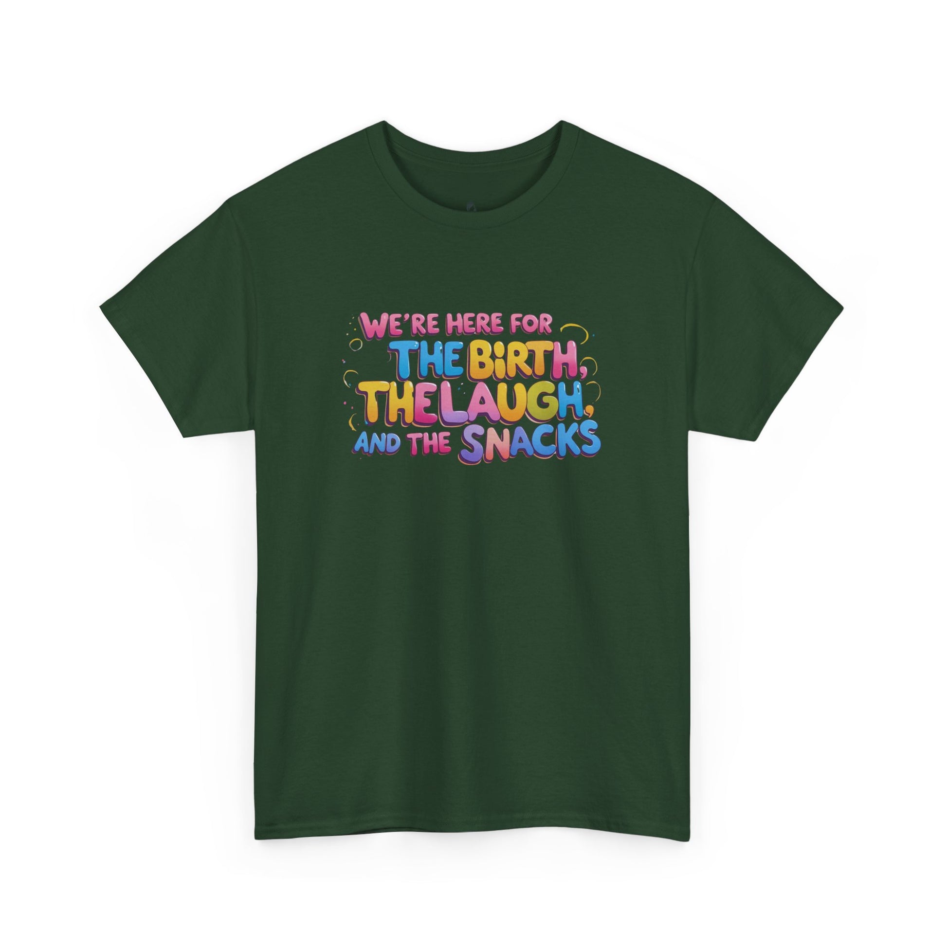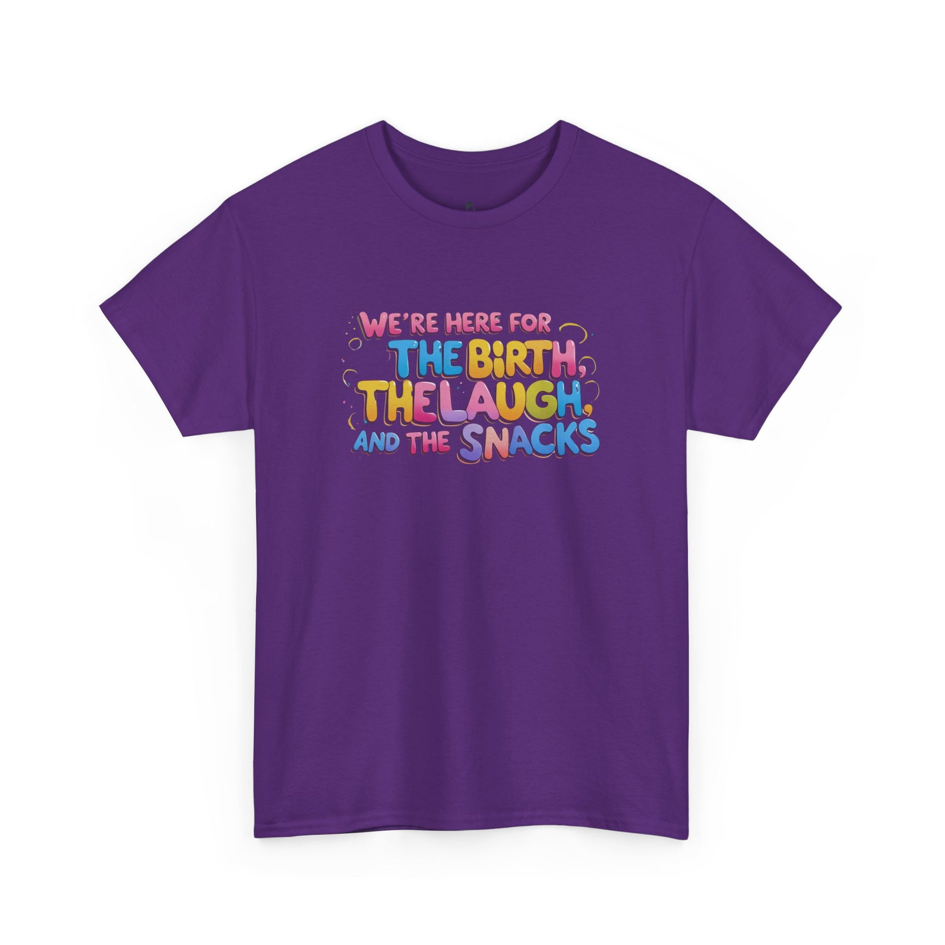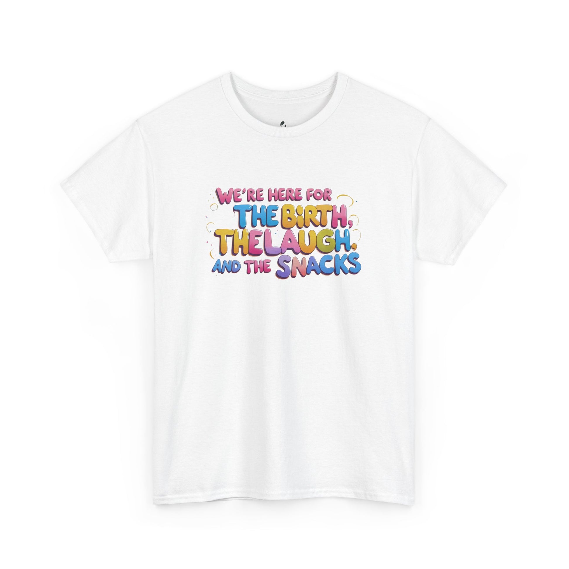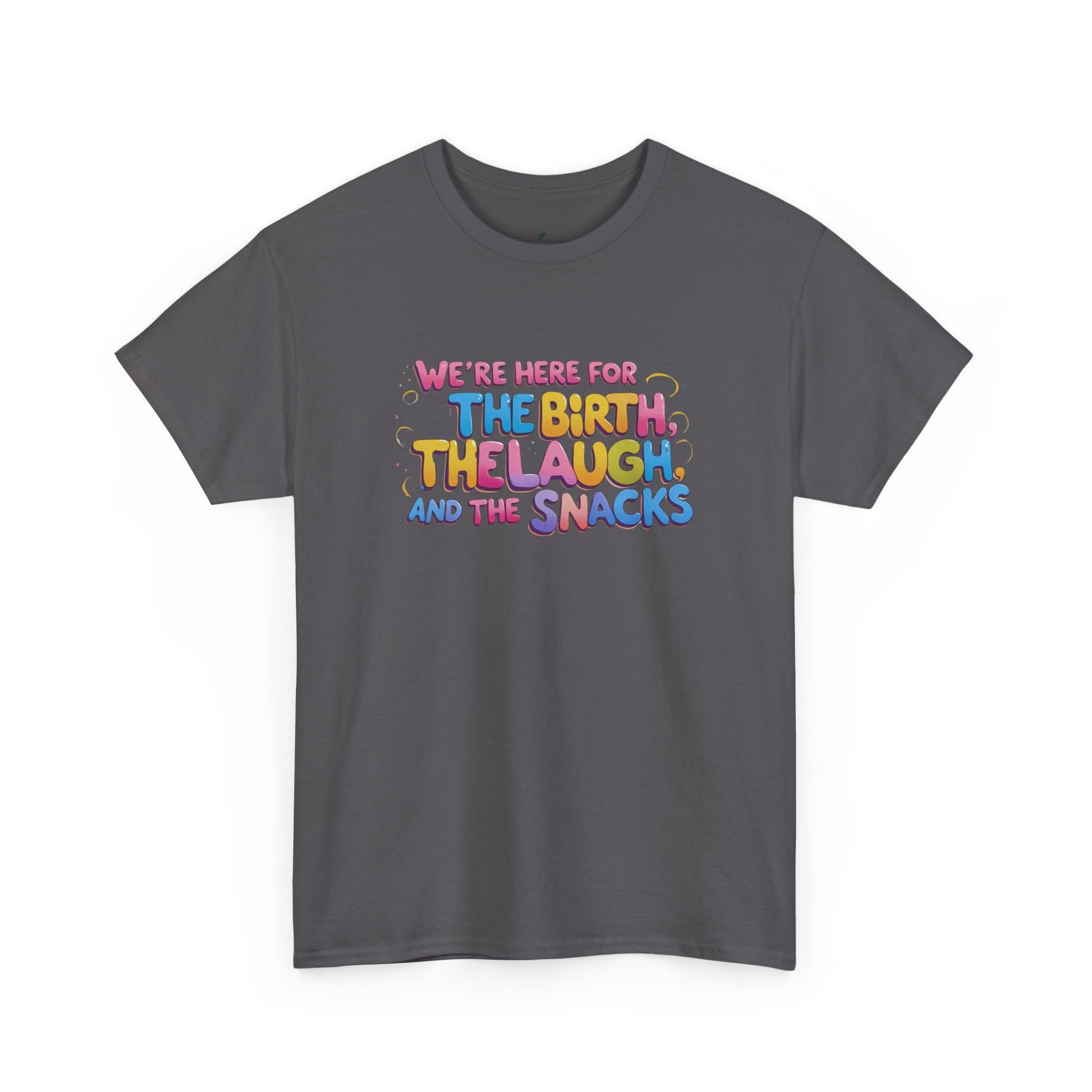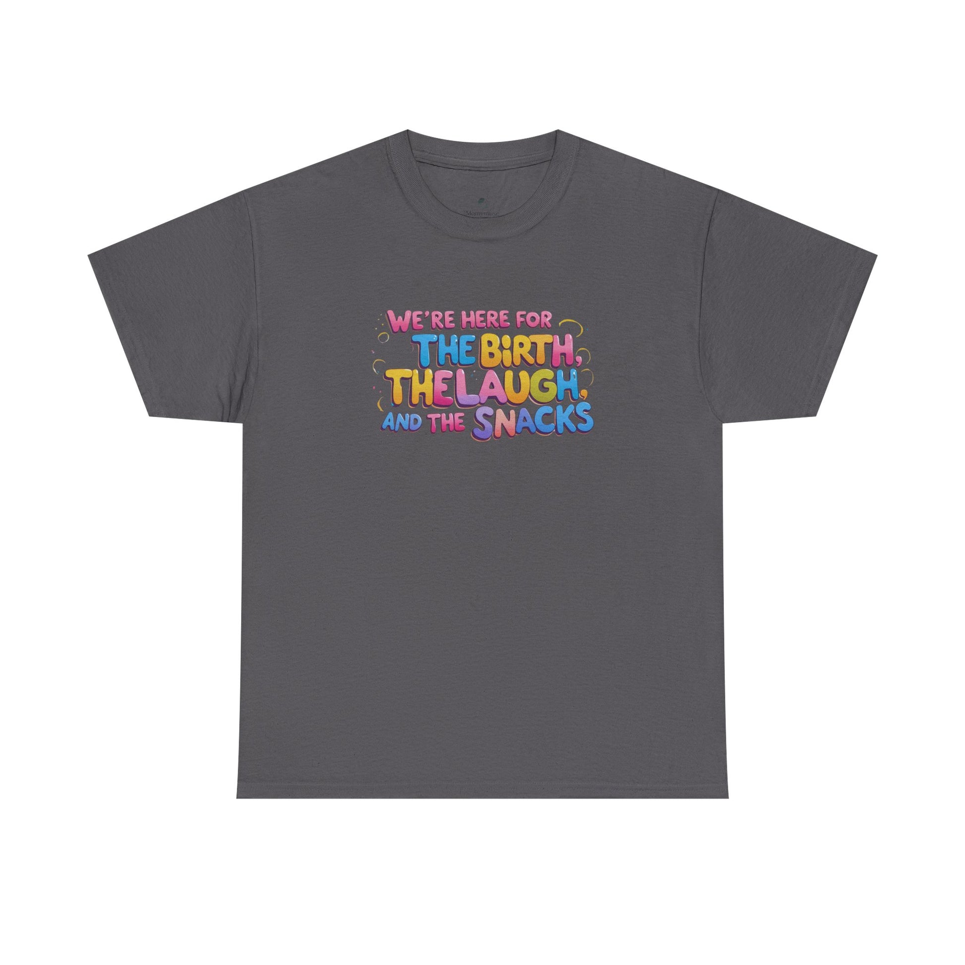 A tee designed to accompany mom to labor, with a focus on birth, laughs, and snacks. This tee gives a cozy and casual vibe, perfect for expecting moms birthing team and family to wear during the labor process. Comfortable and versatile tee for special occasions.